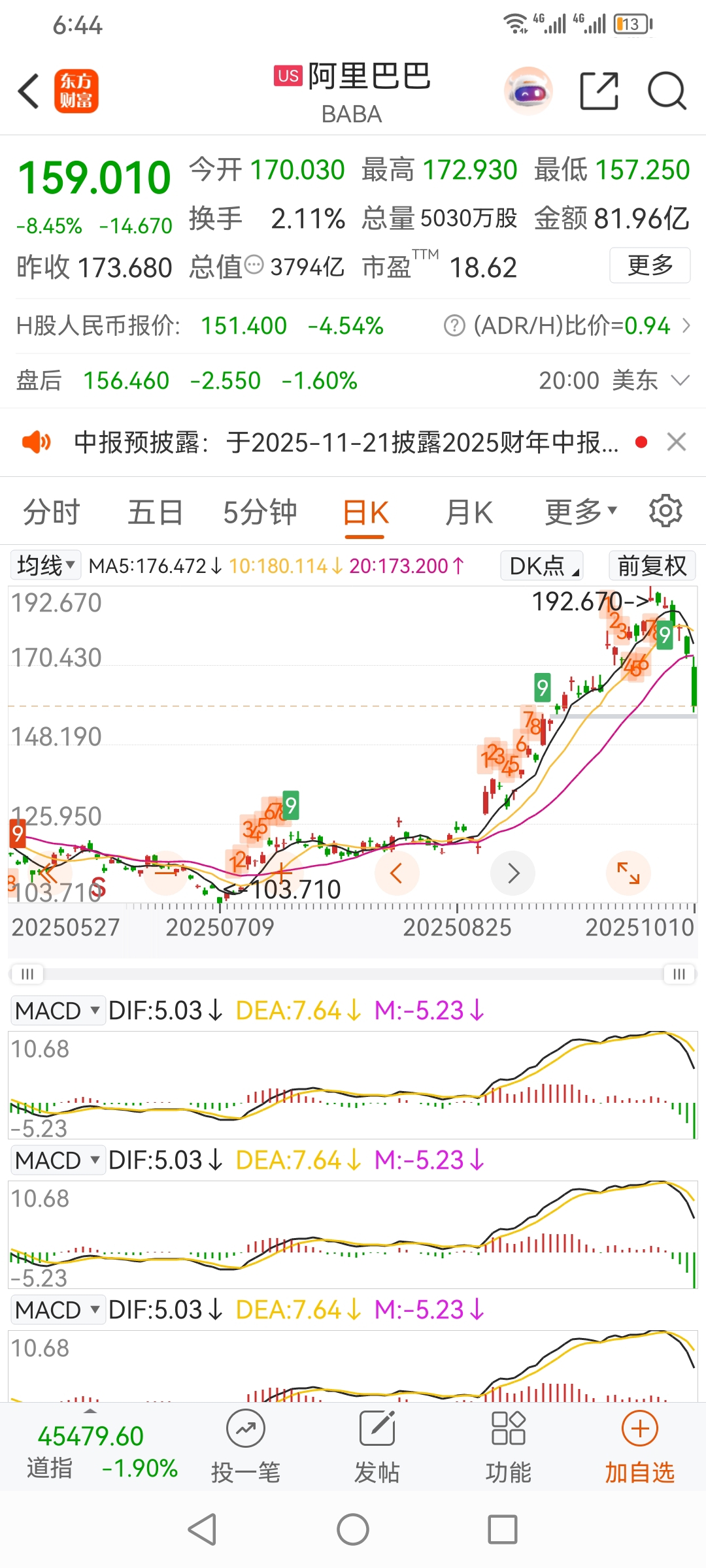 军哥,阿里巴巴,跌破5日均线,亏损5%,坚决卖出。