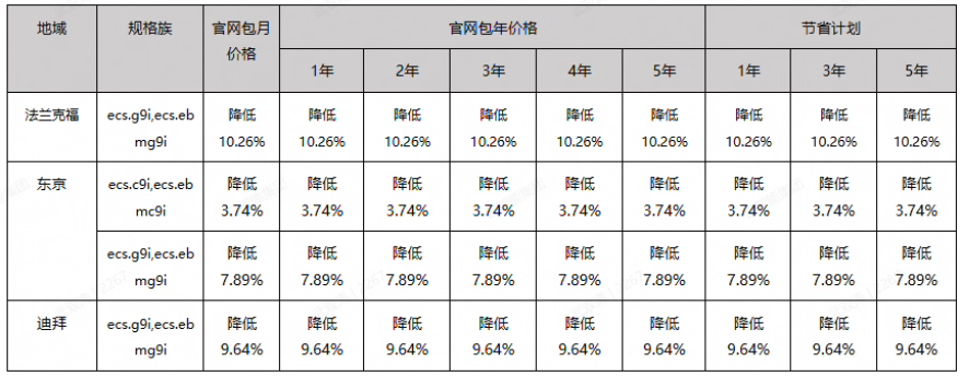 本次价格调整涉及的地域包括法兰克福、东京、迪拜,调整的规格族包括ecs.c9i、ecs.g9i、ecs.r9i、ecs.ebmc9i、ecs.ebmg9i、ecs.ebmr9i,具体价格的调整幅度参考下面表格内容,价格降幅含包月价、包年价及节省计划价格。公告称,本次价格调整仅适用于上述包月价、包年价格及节省计划在生效日后所发起的符合条件订单,包括新购、续费、升降配等。