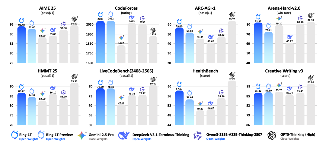 (Ring-1T与业界代表性思考模型的性能横评)
