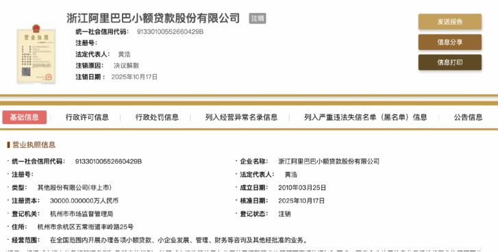 国家企业信用信息公示系统网站显示,浙江阿里巴巴小额贷款股份有限公司登记状态由存续变更为注销,核准日期为2025年10月17日,注销原因为“决议解散”。