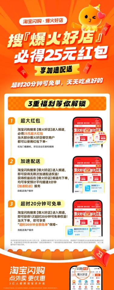 此前淘宝闪购同时宣布,消费者在标记有“超时免单”的商家下单,可享受“超时20分钟免单”保障:超时20分钟及以上,赔付订单实付全额等额红包,最高赔付100元。