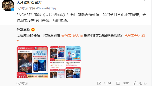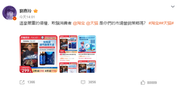 据悉,当天下午,刘嘉玲在社交平台晒出两张淘宝界面截图,并喊话淘宝、天猫:“这么严重的侵权,欺骗消费者,淘宝、天猫,是你们的市场营销策略吗?”