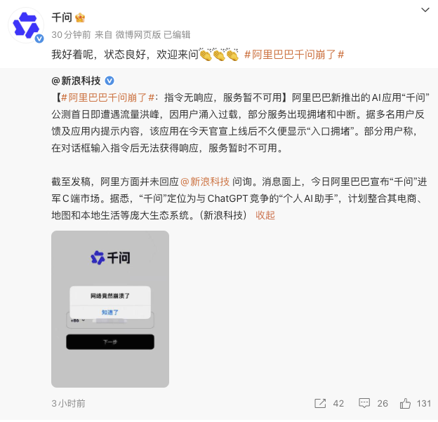 阿里千问回应“崩了”:状态良好,欢迎来问