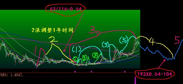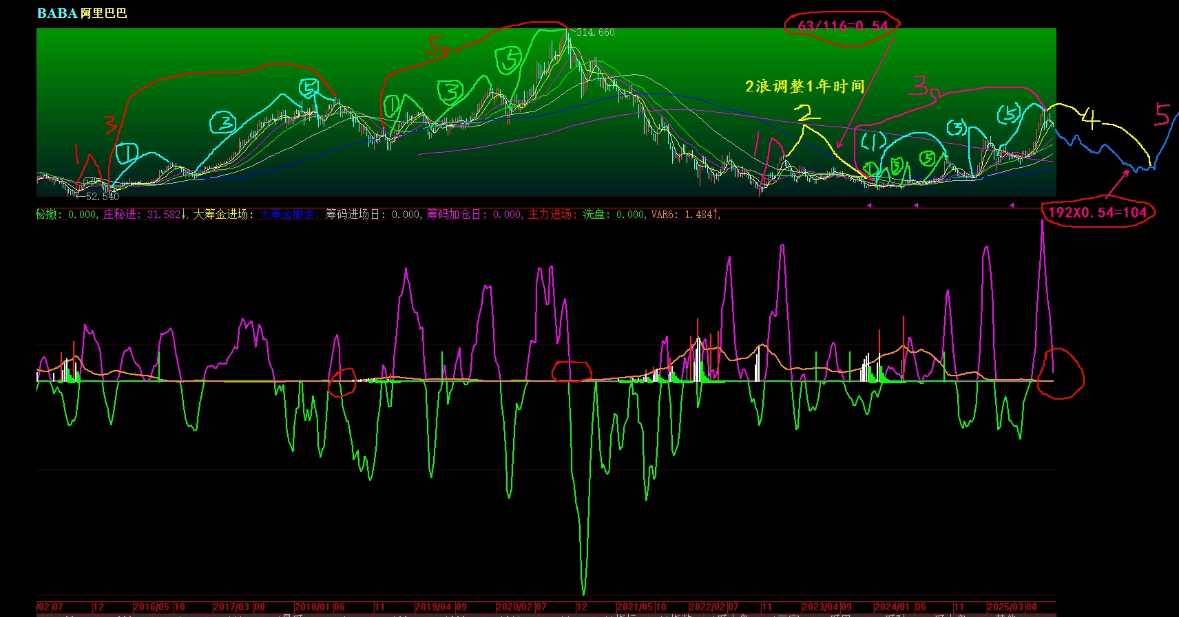 按照浪型对等选择,这波阿里四浪调整要调整到104以下才可以见底