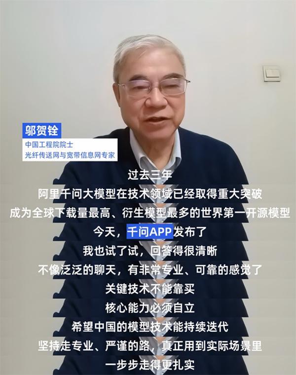 邬贺铨院士:阿里千问APP对科研问题理解到位、回答专业