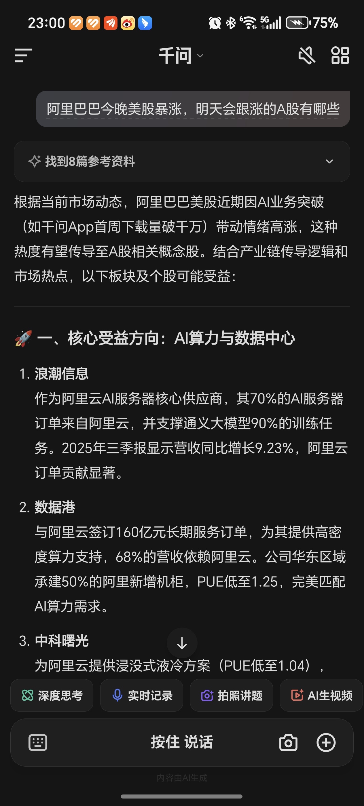 千问告诉你,阿里巴巴大涨,明天A股哪些股会跟