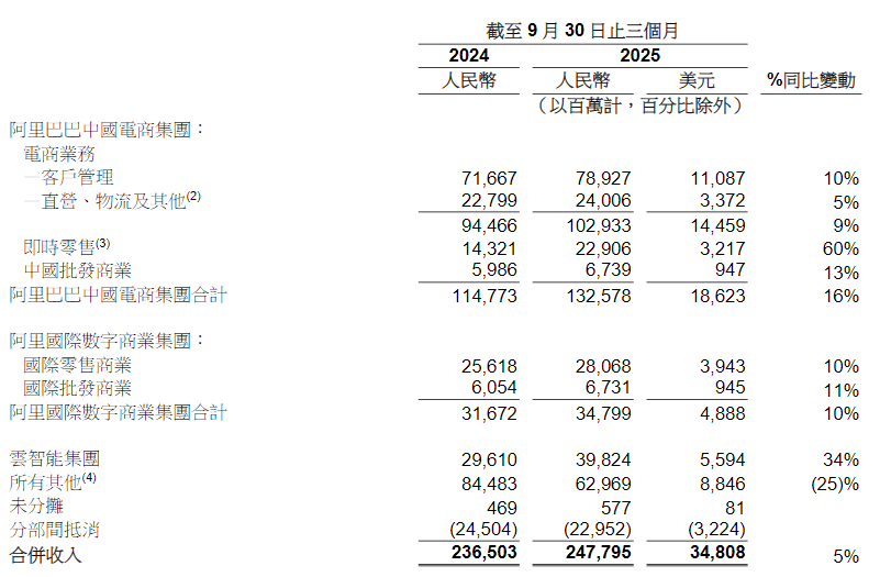本季度,阿里巴巴电商客户管理收入同比增长10%;即时零售业务收入同比增长60%,主要得益于淘宝闪购所带来的订单量增长。电商分部单位经济效益自9月以来显著改善,用户留存率提升,平均订单价格提高,业务规模持续增长,并带动淘宝App的月活跃消费者快速增长。