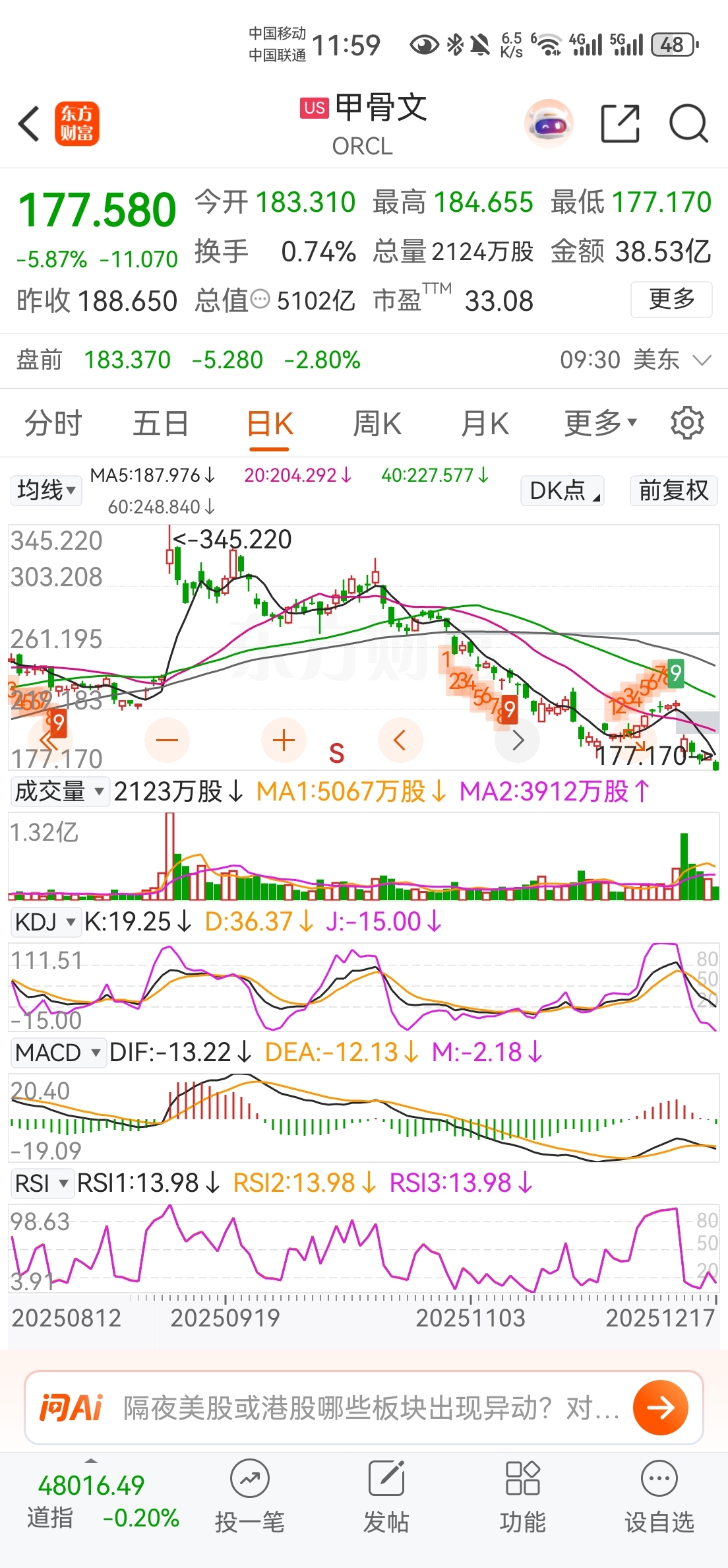 $阿里巴巴(NYSE|BABA)$ 阿里巴巴一直在跟着甲骨文走,今天甲骨文大跌,明天港股阿里巴巴能不能抗住?庄家给点力走出独立行情吧
