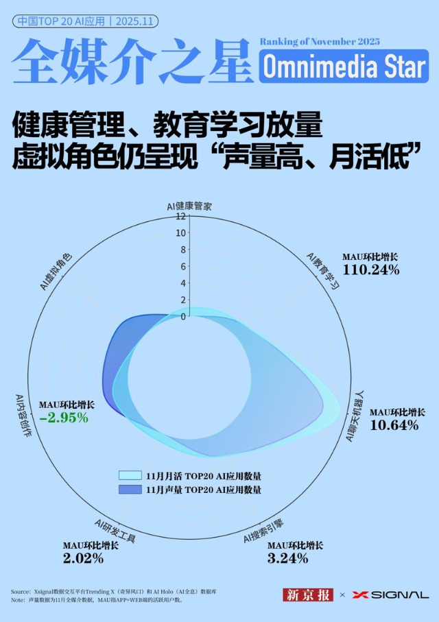 这份榜单由新京报AI研究院与Xsignal联合编制,依据全媒介声量评出2025年11月国内最具影响力的20款AI应用,同时收录产品类别、所属企业及最新月活跃用户数据,以反映行业动态。