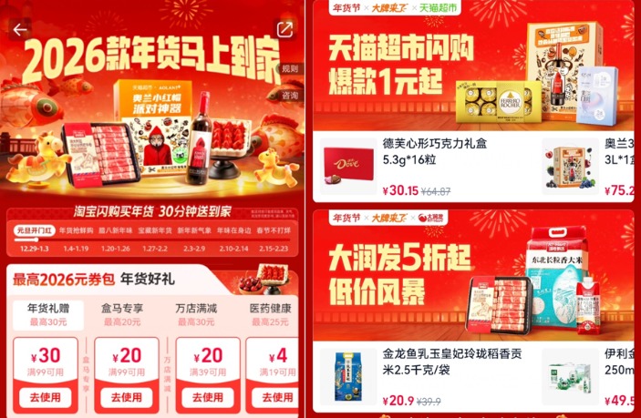 据悉,活动期间,用户搜索“年货节”进入会场,可领取最高2026元的券包,用户领券下单可享受多档满减优惠,覆盖百货、超市、酒水、生鲜等全品类商家。