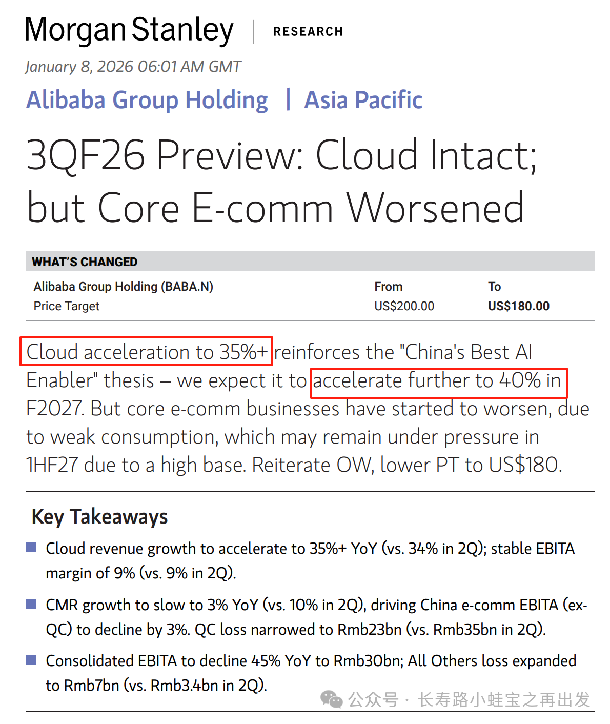宝总找来找去只找到一个原因:就是大摩刚刚新发了一遍报告,提高了云收入的增速预期,而且还把27年预期提高到40%!