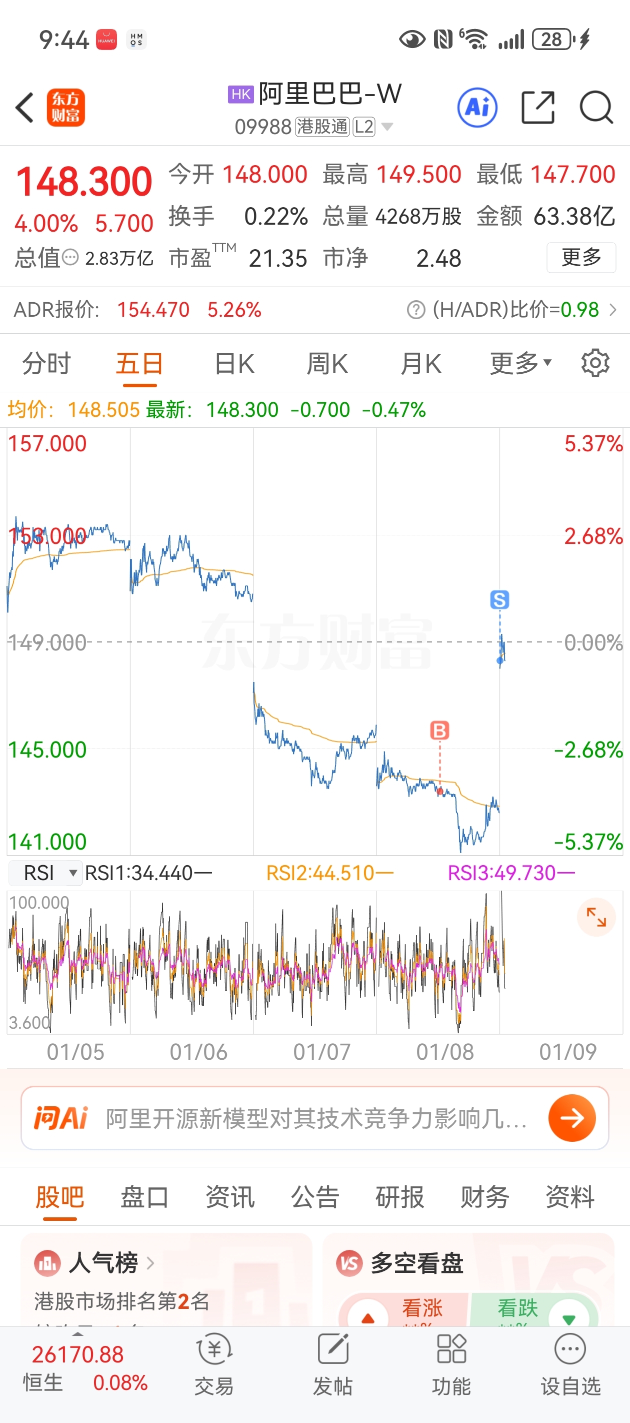 $阿里巴巴(NYSE|BABA)$ 幸亏今天开盘就卖了,估计星期一就是一个低开,为啥这么弱呢