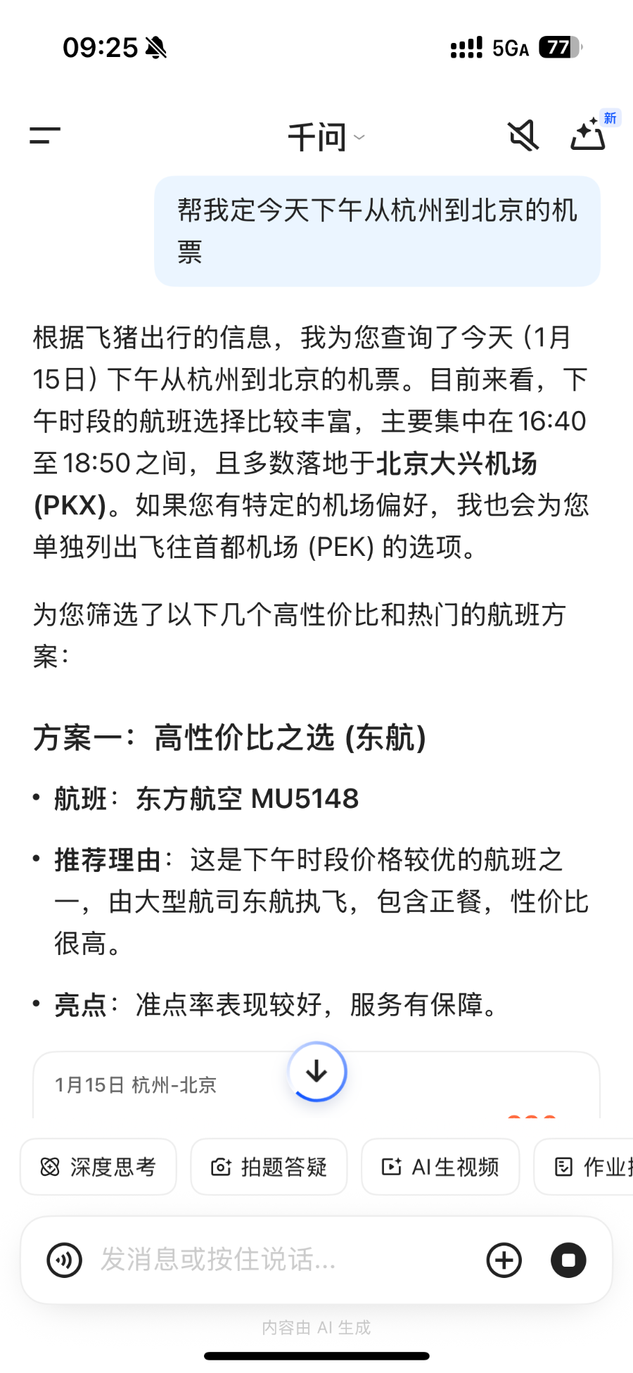 最新实测 阿里千问可点外卖、订机票、定酒店