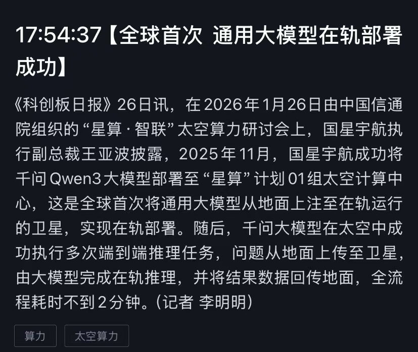 这是全球首次将通用大模型从地面上部署到太空!阿里巴巴的QWEN3真正的太空算力!