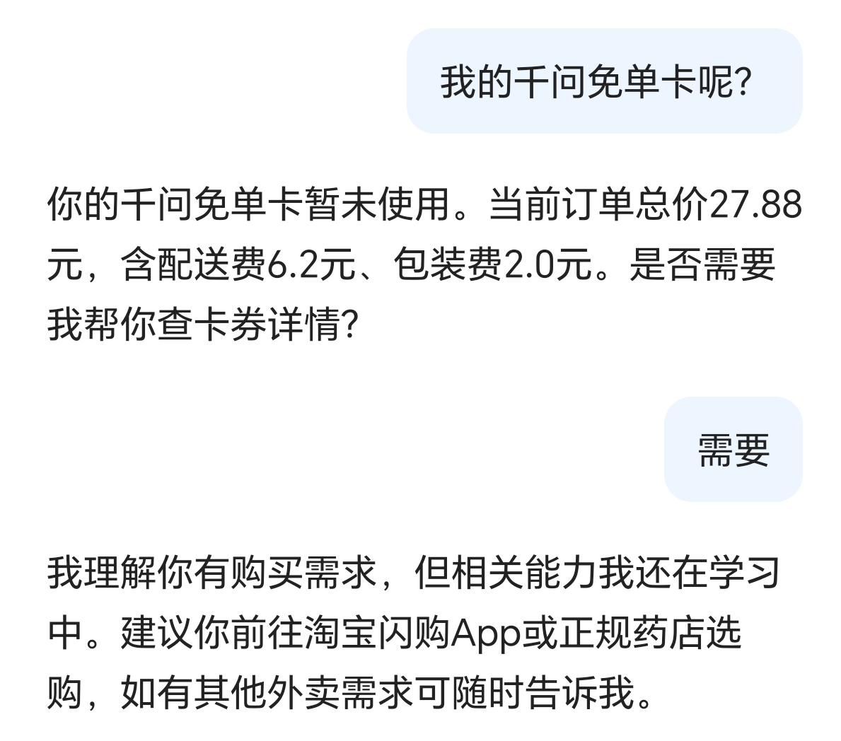 用了一下千问点单,彻底暴露了千问的智商,这水平,还不如阿里自带的AI客服呢,关联