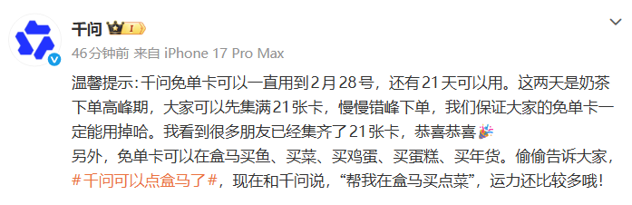 2月7日,阿里千问在其官方微博发文称,将春节免单卡有效使用期限从2月23日延长至28日。同时,全国盒马门店已接入千问App。免单卡可以在盒马买鱼、买菜、买鸡蛋、买蛋糕、买年货。