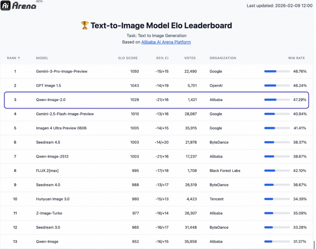 AI Arena文生图评测中,Qwen-Image-2.0位居第三