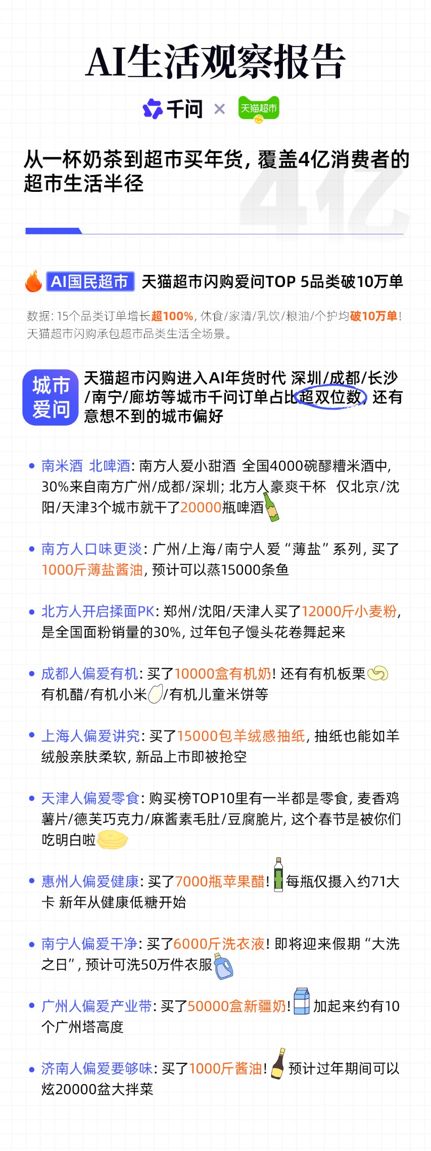 千问联合猫超、盒马、闪购,共同挖掘了更多趣味数据,例如,千问用户最喜爱的热门单品,1000多吨鸡蛋、156万60岁以上用户、南北城市的不同爱好、独特的小酒经济、万里挑一的小众商品等等,整理了这份《AI生活观察报告》,洞察AI时代的新消费。