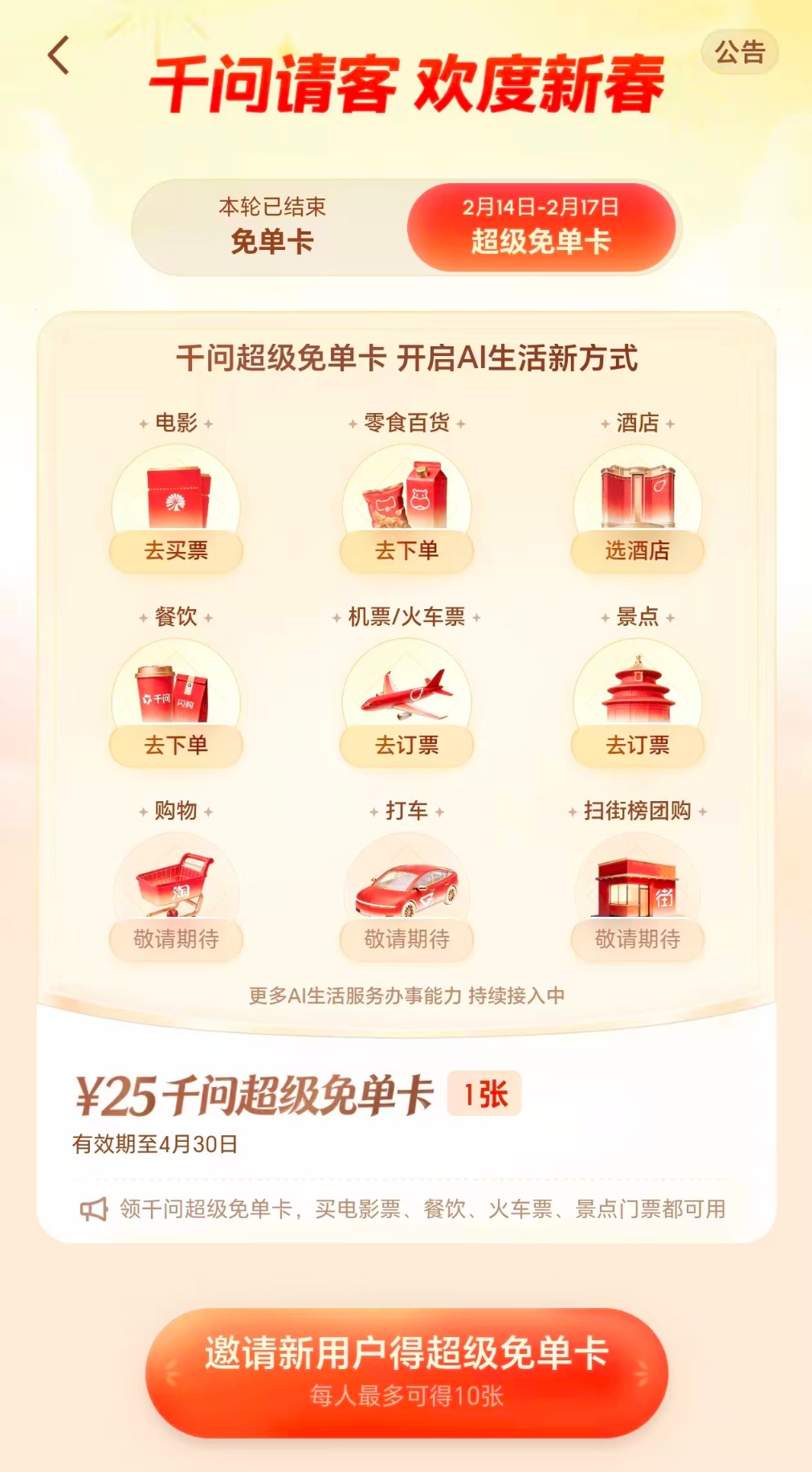 千问APP还显示,新用户打开千问APP后,可直接获得一张25元超级免单卡;所有人每邀请一名“千问新人”双方可各得一张超级免单卡,最多可得10张。此次免单卡需在2月17日前集完。