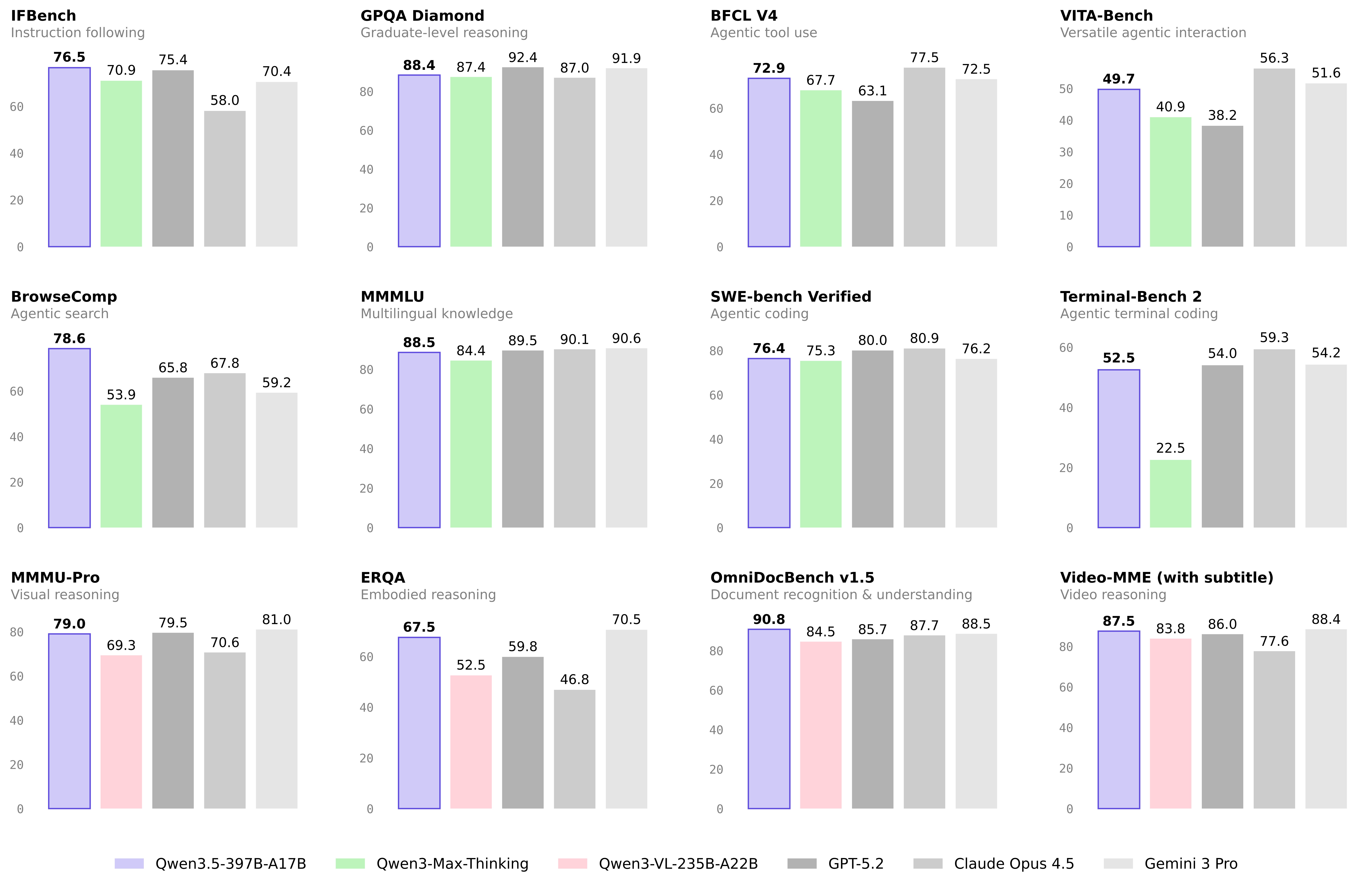 与前几代的千问大语言模型不同,千问3.5实现了从纯文本模型到原生多模态模型的代际跃迁。千问3预训练在纯文本上进行,而千问3.5则基于视觉和文本混合上预训练,并大幅新增中英文、多语言、STEM和推理等数据,让张开“眼睛”的大模型学会了更密集的世界知识和推理逻辑,以不到40%的参数量获得超万亿的Qwen3-Max基座模型的顶尖性能,在推理、编程、Agent智能体等全方位基准评估中均表现优异。在通用Agent评测BFCL-V4、搜索Agent评测Browsecomp等基准中,千问3.5表现均超越Gemini 3 Pro、GPT-5.2。