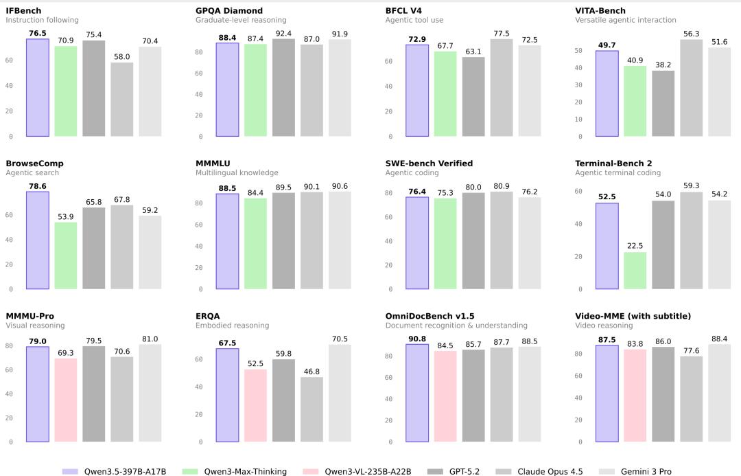 与前代纯文本模型不同,Qwen3.5完成从文本到原生多模态的代际跃迁。模型大幅扩充中英文、多语言、STEM及推理等训练数据,在推理、编程、Agent智能体等全维度基准评估中领跑同级开源模型,多项指标对标甚至超越GPT-5.2、Gemini-3 Pro等闭源头部产品。