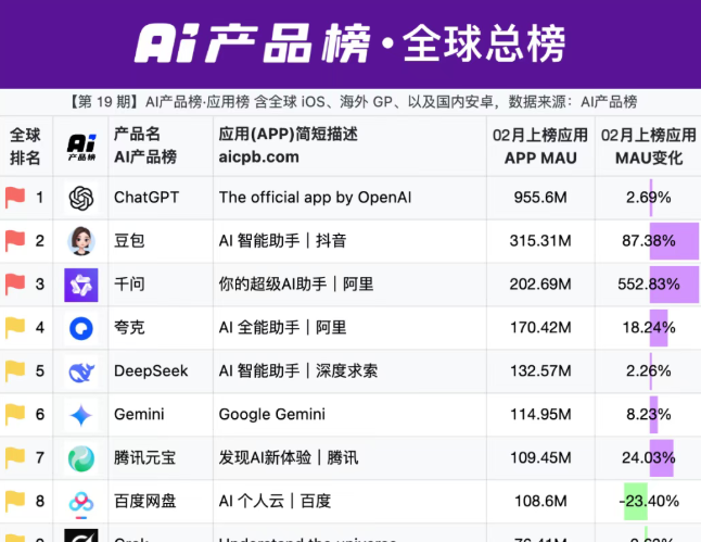 AI产品榜:千问月活用户数增速超550%,增速全球第一