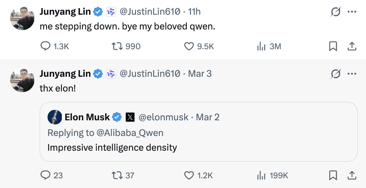 2月16日除夕夜,阿里开源了新一代千问大模型Qwen3.5,该模型实现了模型架构的创新,3月2日晚,阿里巴巴再开源千问3.5系列模型,引发特斯拉CEO埃隆·马斯克在社交平台对该系列模型评论,称赞其“智能密度令人印象深刻”,值得一提的是,林俊旸自宣卸任的前一条动态便是转发马斯克评论并表示感谢。