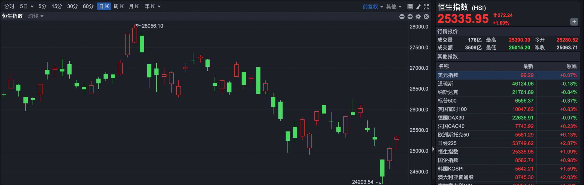 截至收盘,恒生指数报25335.95点,上涨272.24点,涨幅1.09%。