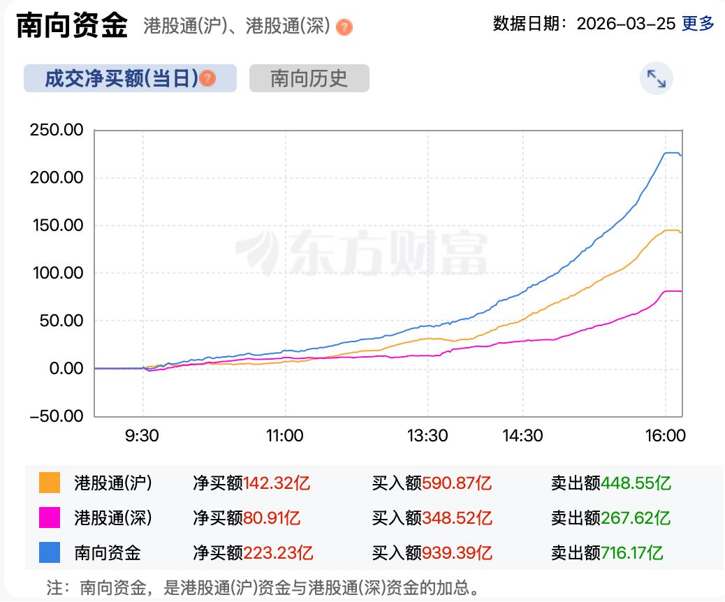 资金方面,南向资金再次大举买入。截至收盘,南向资金净买入港股超223亿港元。