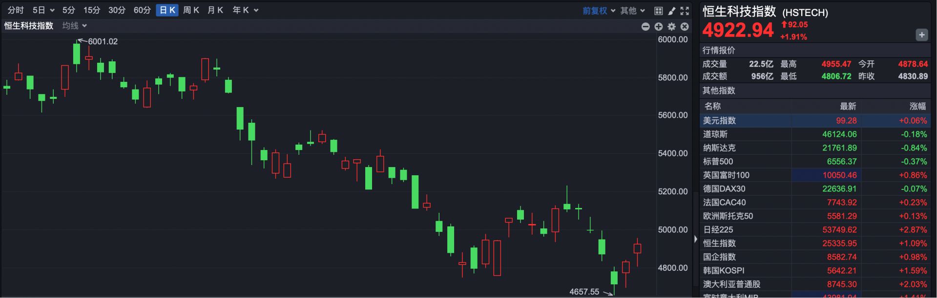 恒生科技指数收盘报4922.94点,上涨92.05点,涨幅1.91%。
