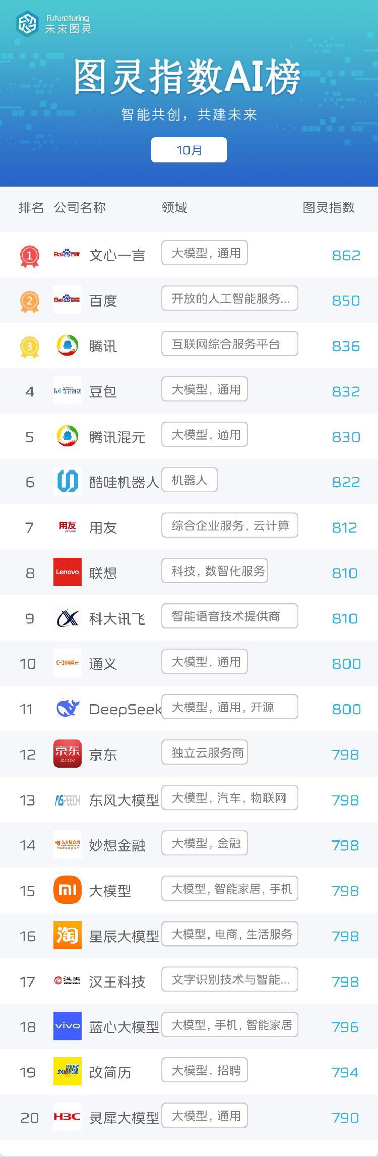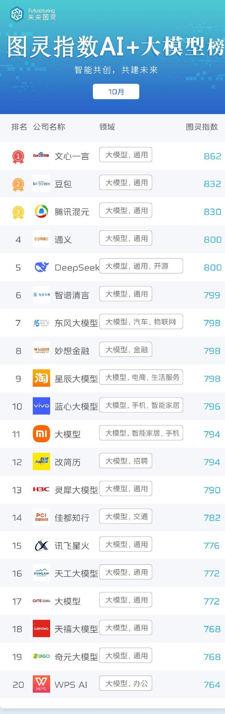 在大模型榜单中,文心一言、豆包、腾讯混元位居前3名;通义、DeepSeek图灵指数同为800,分列第4名、第5名。