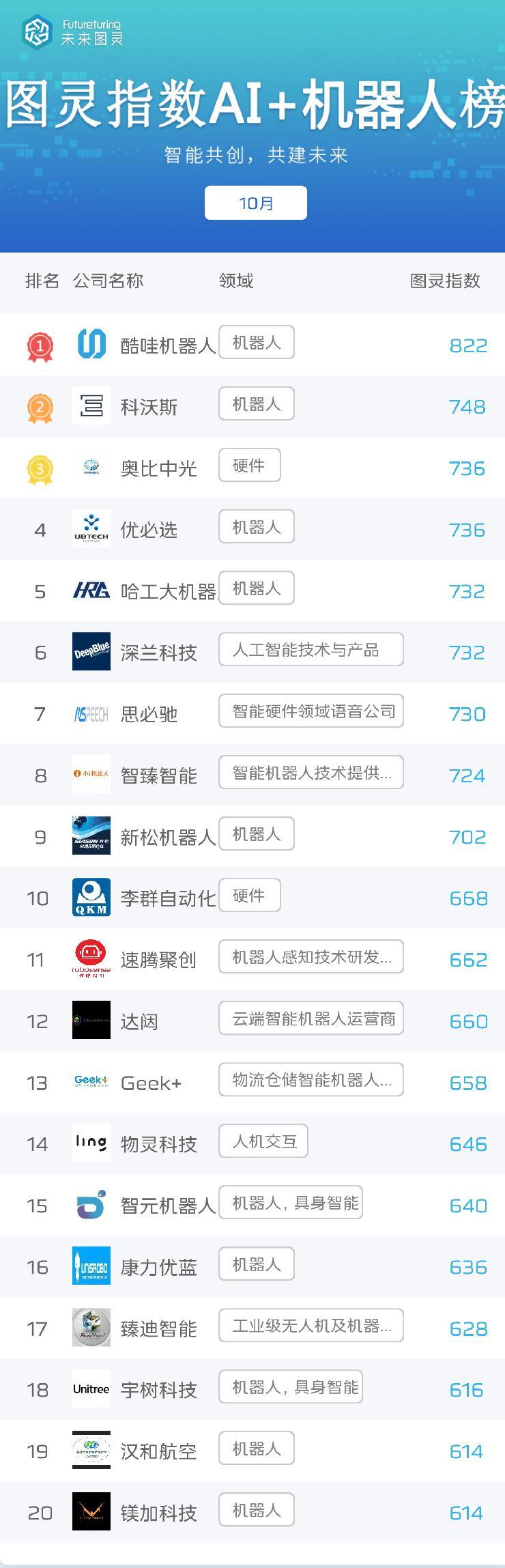 在机器人榜单中,酷哇机器人、科沃斯位居前2名;奥比中光、优必选图灵指数同为736,分列第3名、第4名。