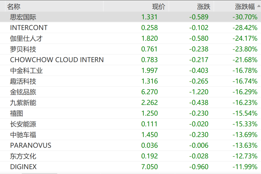 多只中概股加速下挫,跌幅超10%,其中,思宏国际跌超30%领跌。