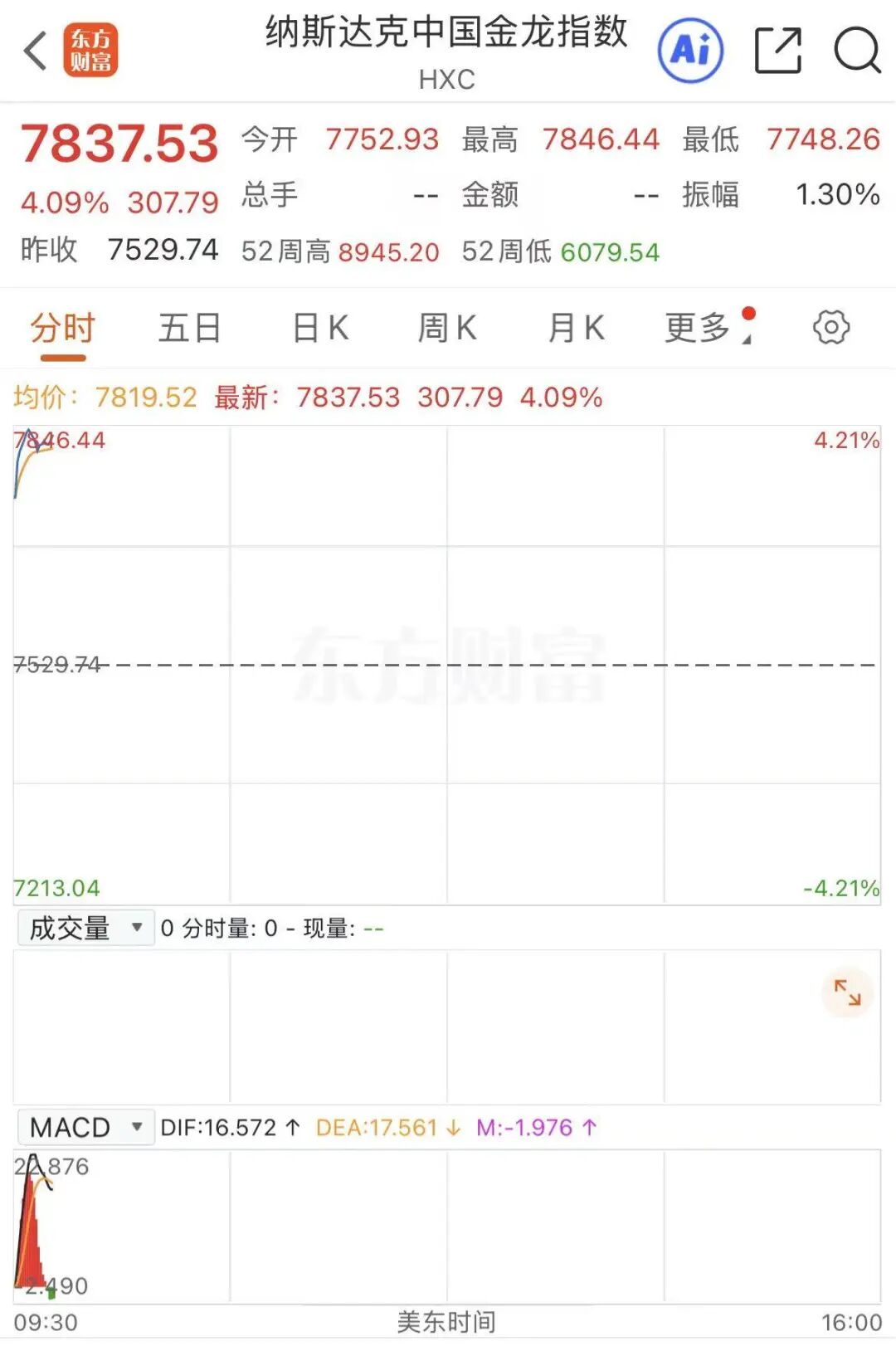 北京时间2026年1月2日,美股三大指数集体高开,截至发稿,道琼斯指数跌0.27%,标普500指数涨0.62%,纳斯达克综合指数涨1.48%。中概股普涨,纳斯达克中国金龙指数涨超4%,阿里巴巴涨近4%,网易涨超7%,哔哩哔哩涨近6%。