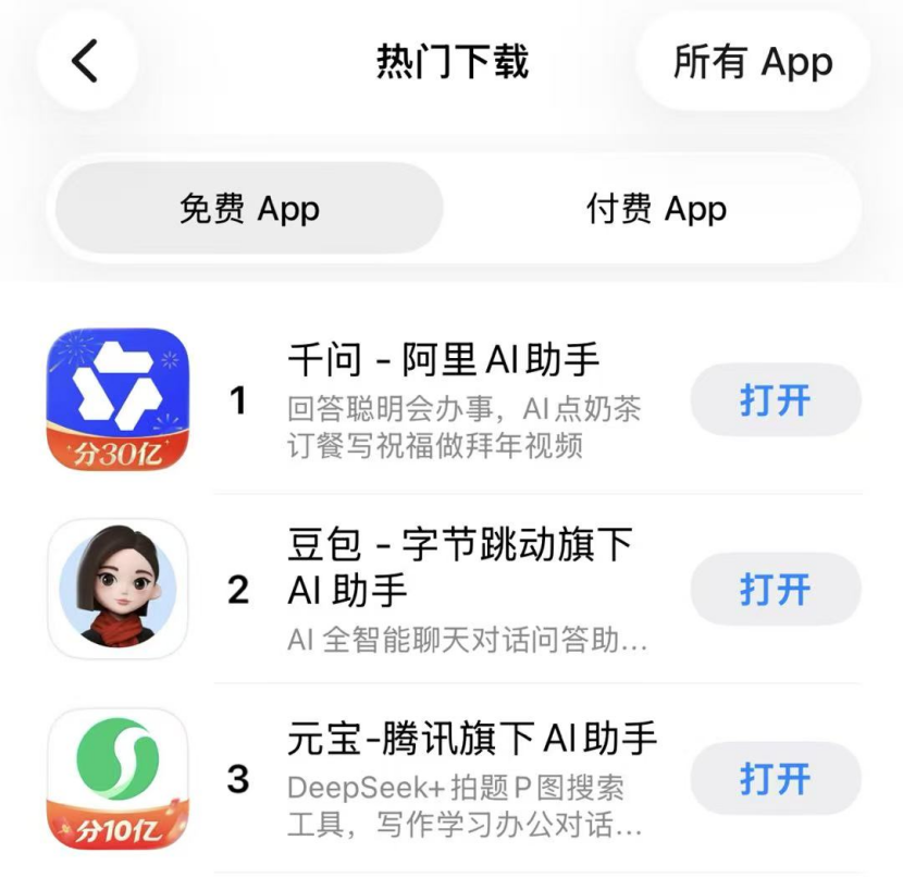 不过,红包大战的带来的好处显而易见,元宝此前一度登上苹果应用商店免费APP榜首,而目前最新的排名为千问、豆包、元宝,前三名均为AI应用。