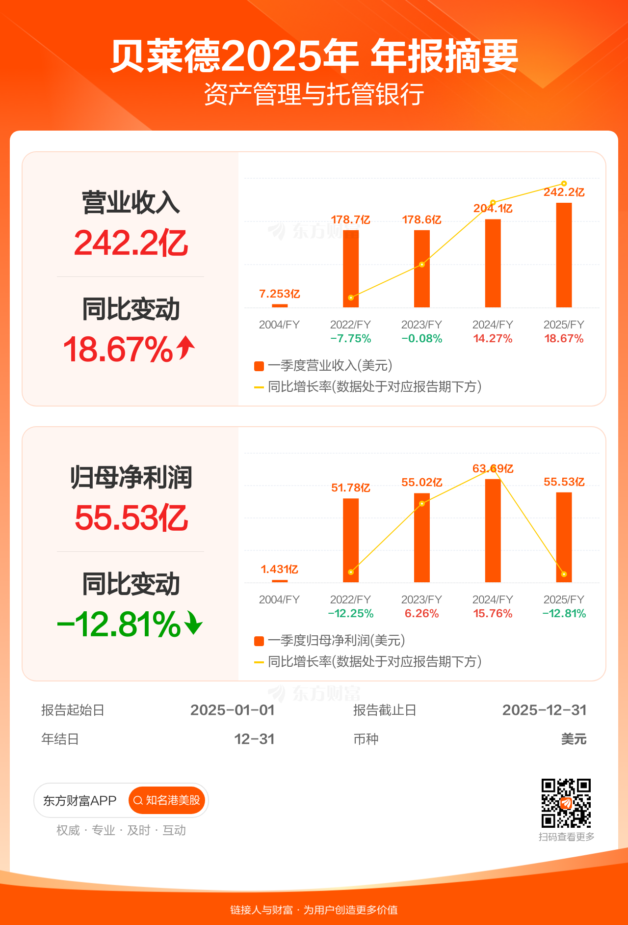 贝莱德1月15日发布年报业绩,截至2025年12月31日的12个月内,该公司营业收入242.16亿美元,同比增长18.67%;公司权益持有人应占溢利(归母净利润)55.53亿美元,同比减少12.81%。