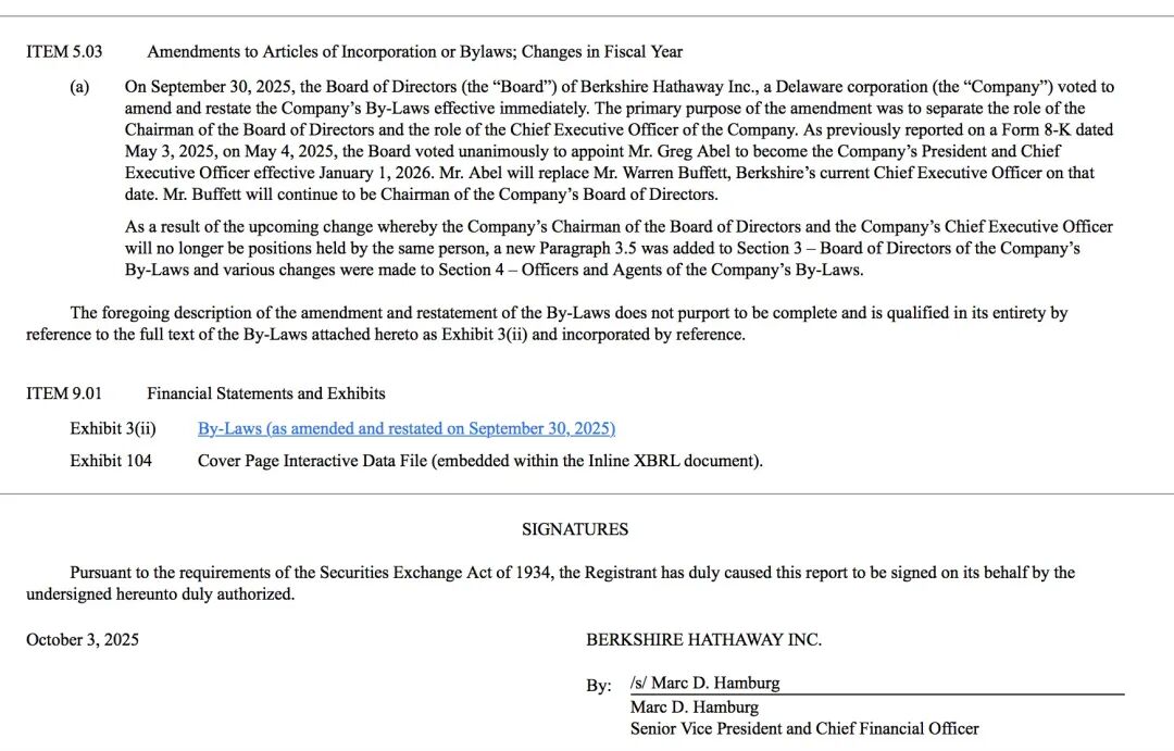 SEC披露文件显示,伯克希尔董事会投票决定修订并重述公司章程,自即日起生效。此次修订的主要目的是将董事会主席职务与公司首席执行官职务进行分离。