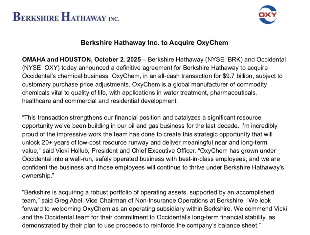 就在本周早些时候,伯克希尔发布公告称,将以97亿美元收购西方石油公司旗下化工业务OxyChem。若交易最终达成,这将是伯克希尔自2022年以来金额最高的一笔收购。值得注意的是,这笔交易由格雷格·阿贝尔策划,是其接班人身份明确以来主导的首个重大并购。