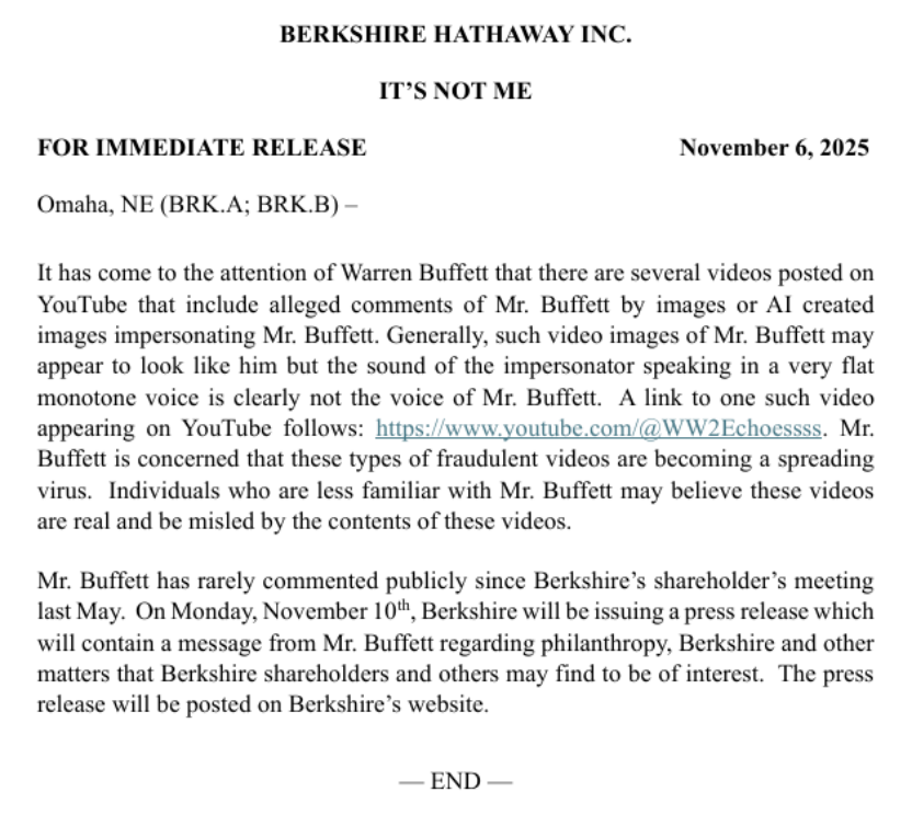日前,美国知名投资人沃伦·巴菲特旗下公司伯克希尔·哈撒韦(下称“伯克希尔”)发布公告称,公司注意到社交平台上出现了若干视频,其中通过图像或AI生成的巴菲特形象进行冒名顶替,并配以所谓巴菲特的评论。通常这类视频中的巴菲特形象看似与本人相似,但冒名者以极其平板单调的声线说话,明显并非巴菲特本人声音。