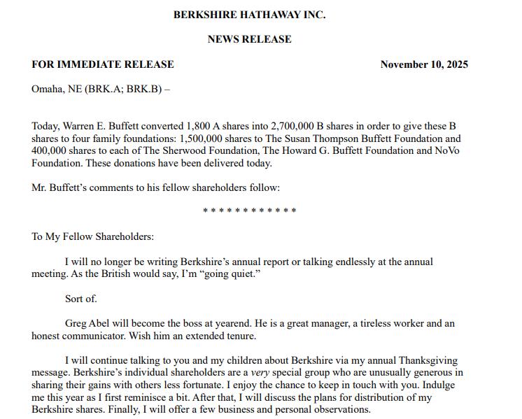 巴菲特宣布,将不再撰写公司年度报告开篇的致辞,但“股神”会继续发表年度感恩节寄语,这项始于1965年的传统将延续,同时还将 “加大”慈善投入力度,捐赠其仍持有的价值1490亿美元的伯克希尔哈撒韦公司股票。