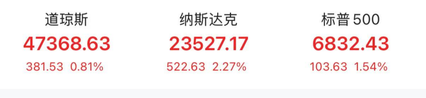 由于美国参议院对结束史上最长联邦政府“停摆”迈出关键一步,重新激发了投资者的风险偏好,美东时间周一,美股三大指数集体收涨。截至收盘,道指涨0.81%,报47368.63点;纳指涨2.27%,报23527.17点;标普500指数涨1.54%,报6832.43点。