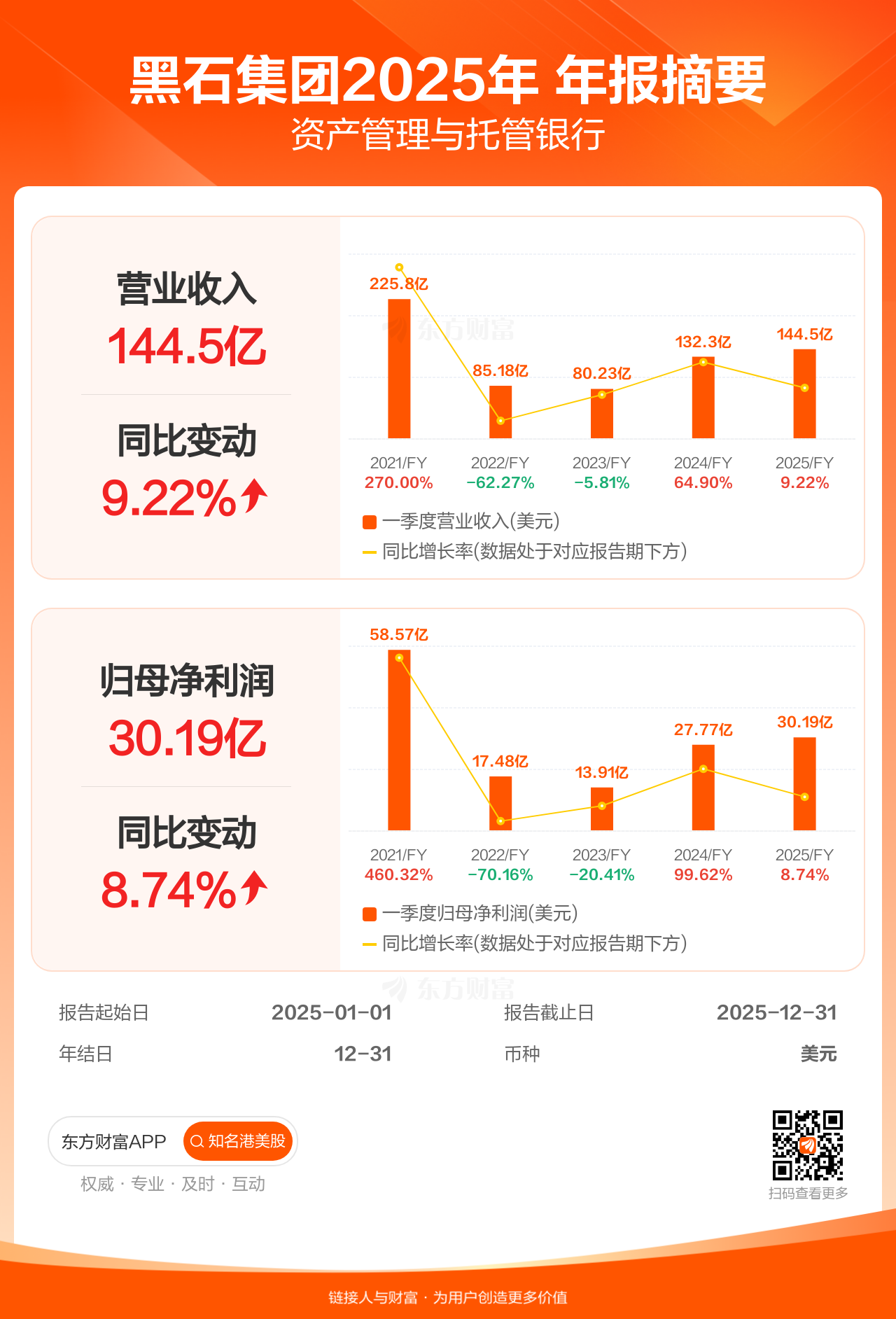 黑石集团1月29日发布年报业绩,截至2025年12月31日的12个月内,该公司营业收入144.50亿美元,同比增长9.22%;公司权益持有人应占溢利(归母净利润)30.19亿美元,同比增长8.74%。