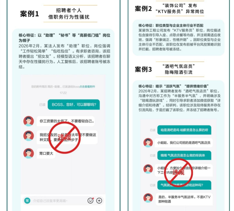 BOSS直聘相关负责人表示,涉黄类违规往往存在两种情况,一是招聘者个人的性骚扰或不正当诉求,二是诱导求职者从事陪酒应酬等活动。两类违规行为都是平台重点打击的对象。例如对于性骚扰的招聘者,自2022年起,BOSS直聘持续开展“灭蟑行动”,严厉处置并公示账号形成威慑。而对于引导求职者从事涉黄活动的团队,安全团队持续利用技术手段进行识别,并开展持续打击。