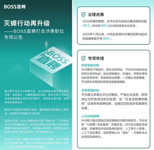 需要指出的是,在这一过程中,“人”的温度与经验仍是不可或缺的一道防线。“涉黄场景复杂、隐蔽,AI只是辅助,最终决定权依然在人的手里。”BOSS直聘安全团队负责人表示。