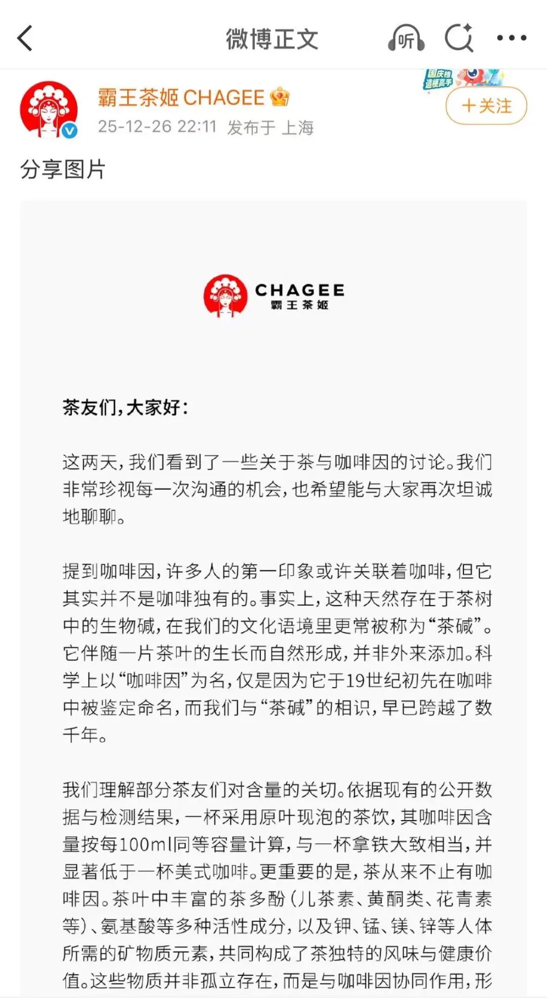 12月26日晚间,霸王茶姬官方微博回应了关于“咖啡因”的争议。霸王茶姬表示,依据现有的公开数据与检测结果,一杯采用原叶现泡的茶饮,其咖啡因含量按每100毫升同等容量计算,与一杯拿铁大致相当,并显著低于一杯美式咖啡。霸王茶姬坚持使用原叶茶汤,而非茶碎、茶末或工业风味剂,这的确可能使茶味更为醇厚饱满,咖啡因的天然含量也相对呈现。霸王茶姬今年3月推出的“轻因·伯牙绝弦”在保留核心茶本味的同时,咖啡因含量降低了约50%。