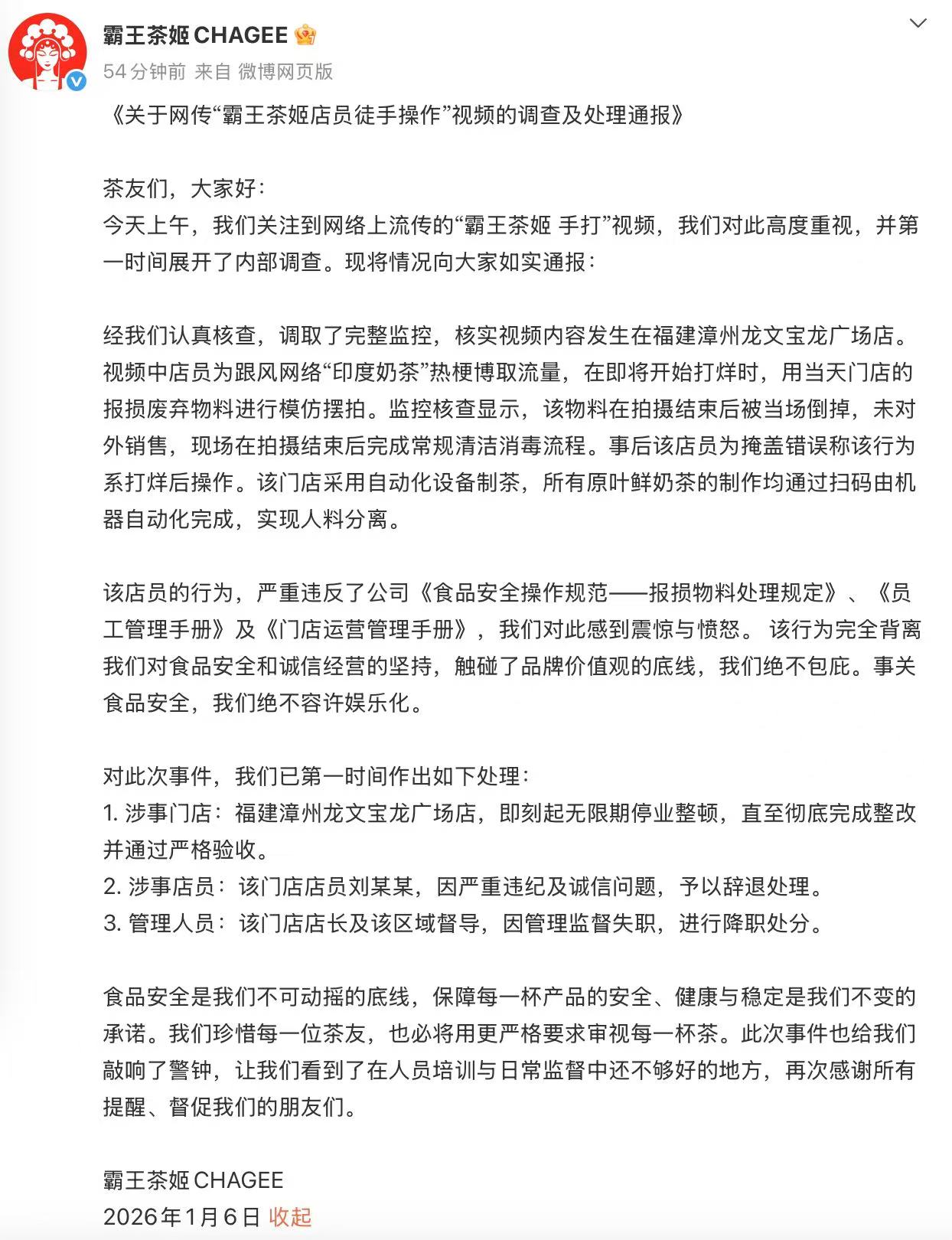 霸王茶姬回应“店员徒手打奶茶”:系员工模仿摆拍,已辞退
