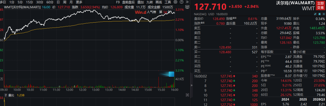 行情数据显示,当天沃尔玛股价一度突破128美元,收盘涨幅近3%,而且市值突破1万亿美元,这也是该公司市值首度突破1万亿美元。