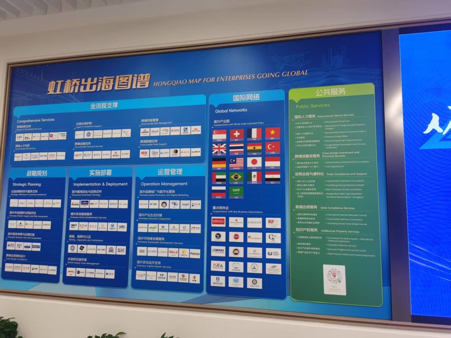 在虹桥海外发展服务中心服务大厅的墙上,有一张巨大的“虹桥出海图谱”。