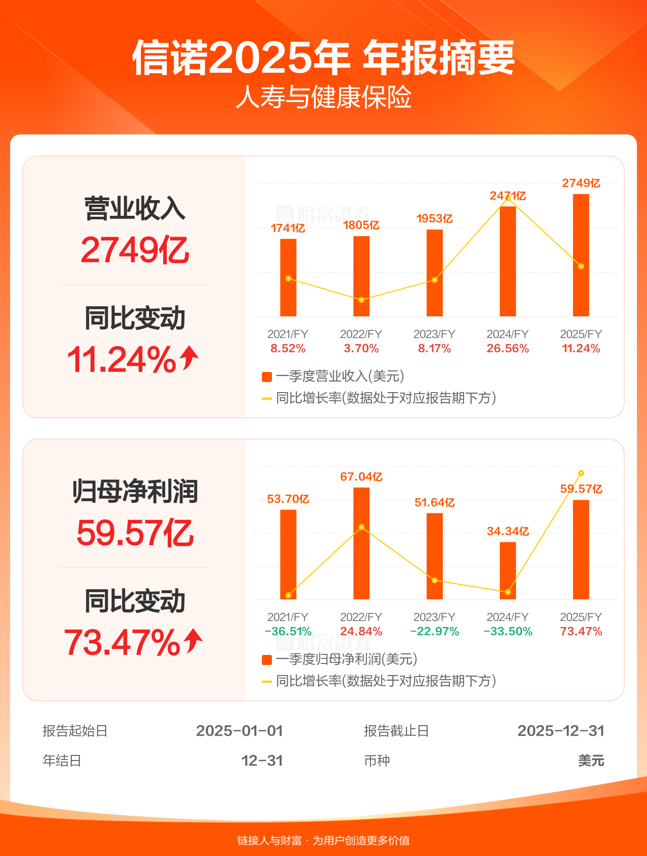 信诺2月5日发布年报业绩,截至2025年12月31日的12个月内,该公司营业收入2749.00亿美元,同比增长11.24%;公司权益持有人应占溢利(归母净利润)59.57亿美元,同比增长73.47%。