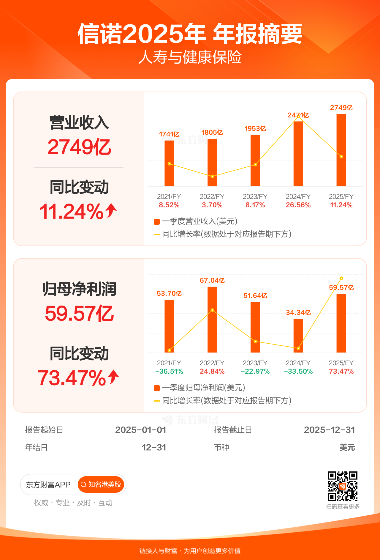 信诺2月5日发布年报业绩,截至2025年12月31日的12个月内,该公司营业收入2749.00亿美元,同比增长11.24%;公司权益持有人应占溢利(归母净利润)59.57亿美元,同比增长73.47%。